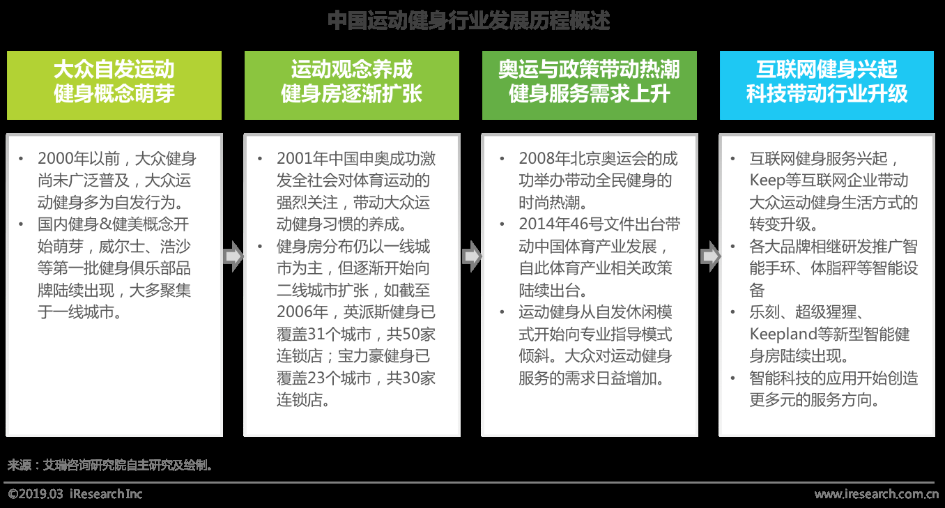 我国运动健身行业从90年代发展至今,经历了大众健身概念萌芽时期、运动观念养成时期、全民健身热潮时期几个阶段。在大众运动健身习惯养成、大型国际赛事带动以及国家政策鼓励的影响下,中国运动健身行业的发展始终保持着稳健的步伐,整体格局稳定,在竞争中也出现了行业的自然洗牌。近些年,随着互联网技术的兴起,运动健身行业进入“互联网+”时代,科技的应用为行业的升级起到了助推作用。