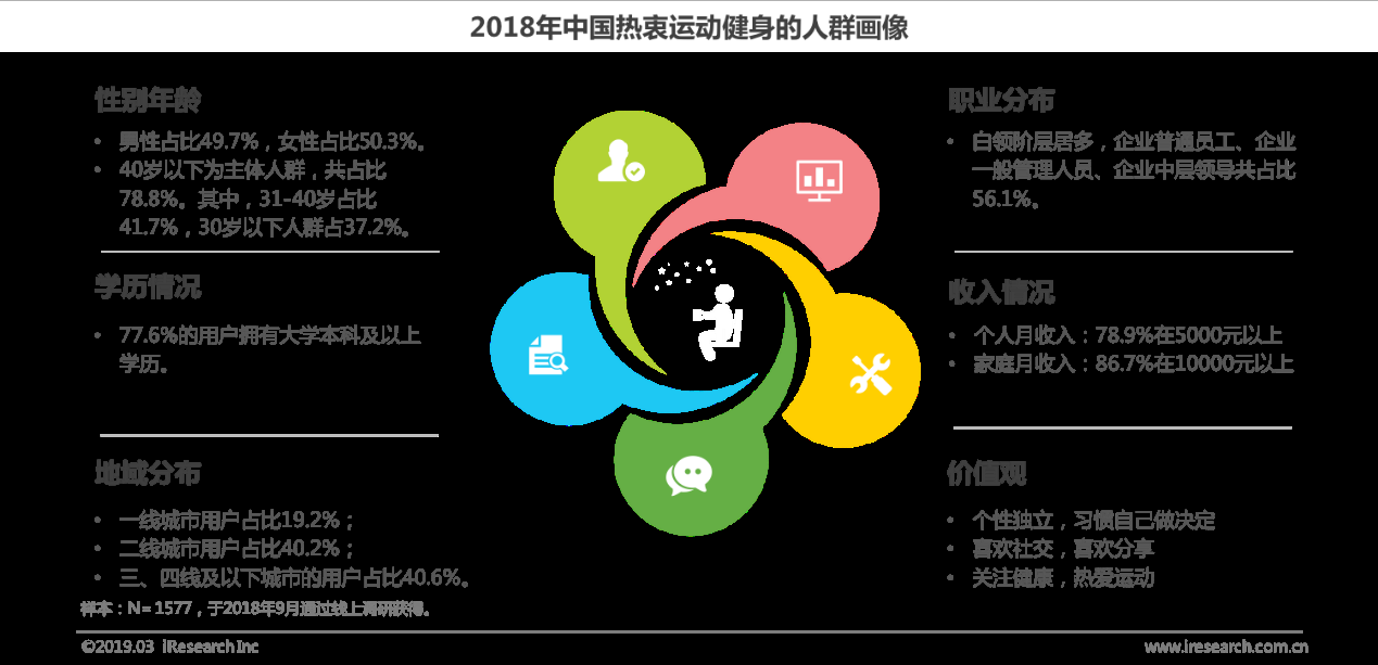 为更深入了解大众对运动健身行业的需求,尤其是对智能科技与运动健身结合的态度,艾瑞咨询对1577名运动健身用户进行了调研。运动健身用户普遍学历较高,白领阶层居多,家庭收入较为稳定,价值观表现为个性独立,喜欢社交,关注健康,热爱运动。