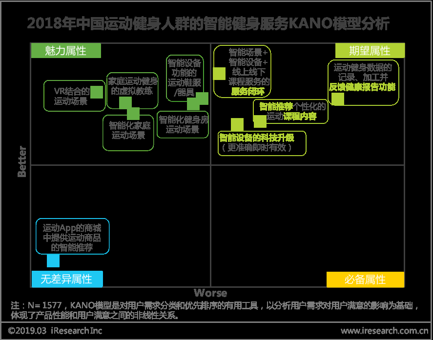 从运动健身智能服务的KANO模型分析结果来看,“运动健身数据记录、加工并反馈健康报告功能,智能场景+智能设备+线上线下课程服务的服务闭环,智能推荐个性化的运动课程内容,智能设备的科技升级”是用户的重要期望属性,企业应优先考虑改善和发展该类服务。