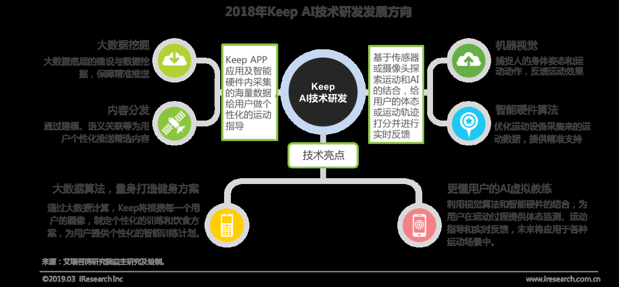 在技术发展方面,Keep研发并完善智能硬件算法、大数据挖掘、内容分发、机器视觉等技术,为用户带来更全面的集智慧推荐、数据反馈、运动指导等综合的智慧运动体验。