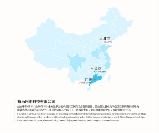 目前布马网络全国有三个分部:广州营销中心,北京媒体媒介中心,长沙新媒体中心。公司推出行业首创的团队对一服务,网络营销服务团队人员超过150人,累计合作企业客户8000余家,其中帮助1000余家大中型企业实现产品的推广和影响力的扩展、帮助2000余家中小型企业在网络树立了品牌形象、搭建并完善了网络营销渠道、细化了产品推介方式等,广受客户好评。布马网络如今已成为华南地区网络营销机构领头羊。