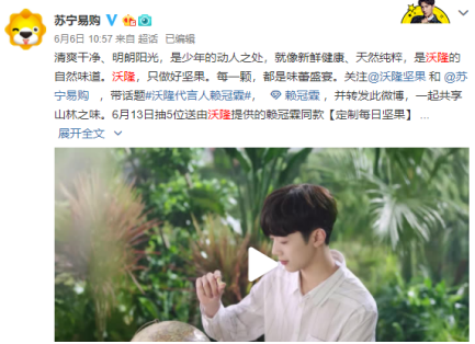 6月6日沃隆正式在各大平台官宣代言人,牵手代言人赖冠霖TVC来袭,充分满足粉丝期待。清新舒适的画风,让观众一秒邂逅大自然的味道,赖冠霖演绎的高颜值首席鉴果师,甄选全球优质产地,让选出的每一颗坚果都被宠爱“冠”名,给你温暖陪伴。果不其然,这支高品质视频,一经发布就引发粉丝尖叫式疯狂转评,成功吸引粉丝关注。