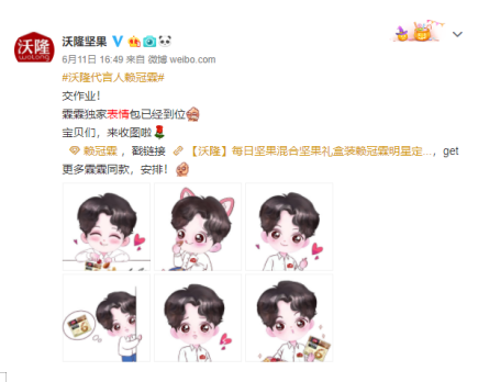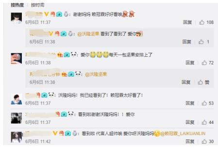 日常运维上,官博花式翻牌玩梗评论,与粉丝打成一片,贴心设计Q版表情包九宫格、粉丝第一视角花絮视频等让粉丝惊喜不断,沃隆对代言人赖冠霖的实力宠爱,收获了极高的粉丝赞誉,粉丝对偶像的情感归属,也逐步转化为对沃隆的好感度和忠诚度。