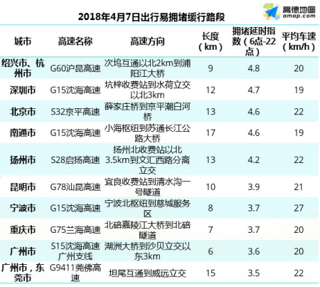 返程方面,预计4月7日交通压力较大高速路段为G60沪昆高速(次坞互通以北2km到浦阳江大桥),全天拥堵延时指数为4.8,平均车速20km/h,其次是G15沈海高速深圳段(坑梓收费站到水荷立交以北3km),全天拥堵延时指数4.7,平均车速约19km/h左右。