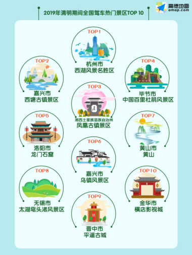 《报告》显示,清明小长假期间,全国驾车十大热门景区中,杭州西湖风景名胜区出行热度最高,其次是西塘古镇景区、凤凰古城景区、中国百里杜鹃风景区、龙门石窟、乌镇风景区、黄山、太湖鼋头渚风景区、平遥古城、横店影视城。