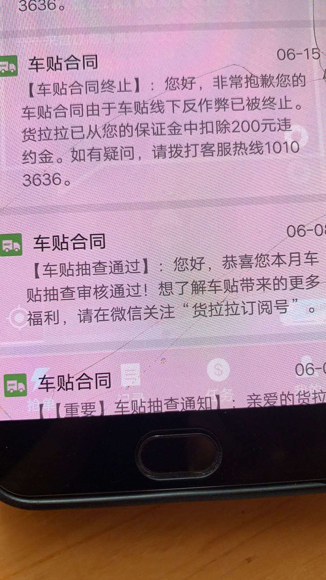 田师傅说很多司机为了避免被交警处罚都会撕掉贴纸,但这时通不过货拉拉系统抽查,短信只是提醒“抽查未通过”,可自己在6月中旬参加了滴滴货运的司机培训会后,收到的货拉拉提醒短信却是“车贴合同由于车贴线下反作弊被终止”,被扣除了200元违约金并封号,这是之前从未有过的情况。