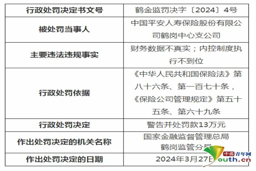 中国青年网讯(记者 张亚云)近日,国家金融监管总局黑龙江监管局发布行政处罚信息,平安人寿保险股份有限公司鹤岗中心支公司因财务数据不真实,内控制度执行不到位,被国家金融监管总局鹤岗监管分局警告并处罚款13万元。