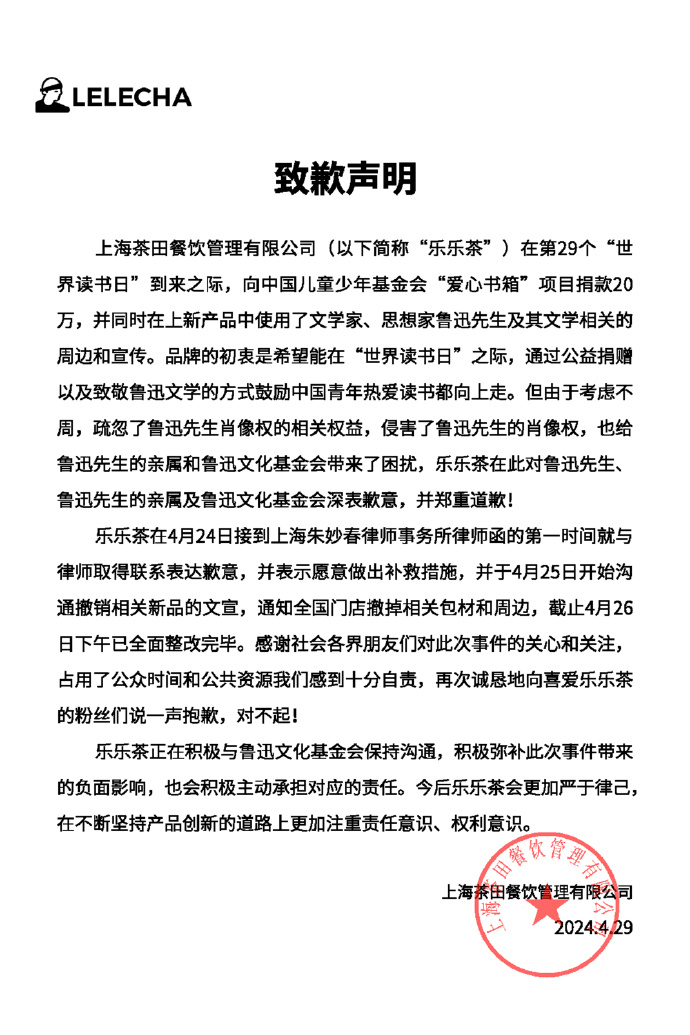 乐乐茶表示,由于考虑不周,疏忽了鲁迅肖像权的相关权益,侵害了鲁迅的肖像权,也给鲁迅的亲属和鲁迅文化基金会带来了困扰,在此对鲁迅、鲁迅的亲属及鲁迅文化基金会深表歉意,并郑重道歉。