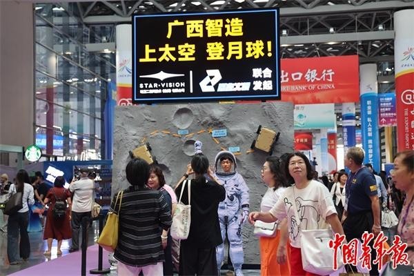 第22届中国—东盟博览会暨中国—东盟商务与投资峰会展出项目吸引了大量观众。“广西智造上太空登月球”展台吸引众多观众打卡拍照。中青报·中青网记者 谢洋/摄
