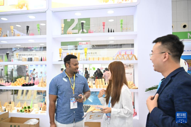 9月24日,在天津梅江国际会展中心,参展商与来自埃塞俄比亚的客商在展会现场开展合作洽谈。