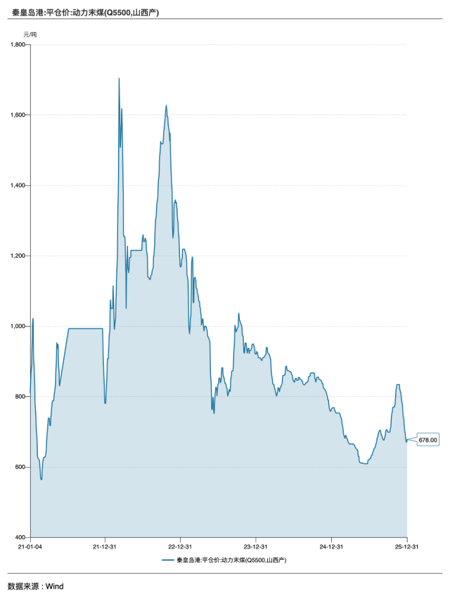 价格方面,去年煤价中枢较前一年显著下移。据Wind数据,2025年全年,秦皇岛港5500大卡动力煤现货平仓价均价为696.88元/吨,同比下降18.49%,年内价格运行区间在609元/吨至834元/吨之间,其最高点仍低于2024年的年均价854.92元/吨。
