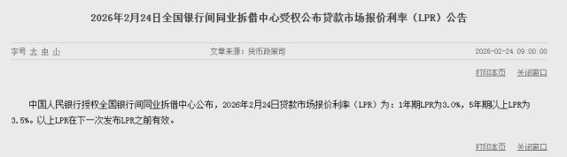 中新经纬2月24日电 央行网站24日消息,中国人民银行授权全国银行间同业拆借中心公布,2026年2月24日贷款市场报价利率(LPR)为:1年期LPR为3.0%,5年期以上LPR为3.5%。以上LPR在下一次发布LPR之前有效。