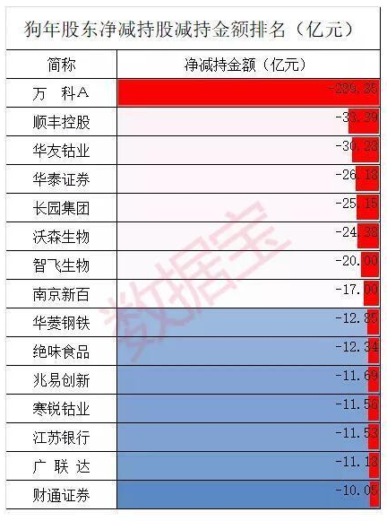减持最多的股票是万科A。数据显示,万科A狗年累计被减持金额高达289.85亿元,包括安邦系和宝能系,都大举减持了万科股份。顺丰控股位居减持榜第二位,累计净减持金额达到33.39亿元,包括高管刘冀鲁和一众创投机构均在减持股东名单之列。曾经的大牛股如今的大熊股,华友钴业位居净减持榜单第三位,累计净减持金额超过30亿元。此外,华泰证券、长园集团、沃森生物等11股净减持金额均超过10亿元。