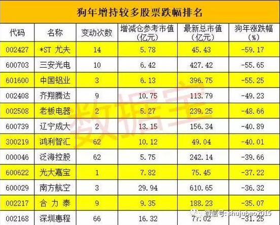 不过,作为上市公司自家人或者是重要股东,它们对公司经营等各方面情况最为了解,市场低迷时,重要股东们出手增持,体现对公司未来发展的信心。这类股票未来能否跑赢大盘呢?不妨看看增持超过5亿元以上且股东被套较多的股票。数据宝统计显示,狗年股东净增持超过5亿元的个股中,有12只股票狗年跌幅超过30%。其中,*ST尤夫下跌超过59%居首,三安光电、中国铝业两只个股跌幅也超过50%。