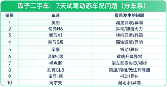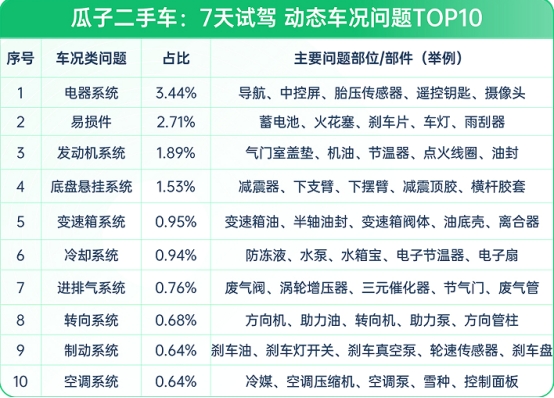 (图:瓜子二手车-7天试驾动态车况问题TOP10)