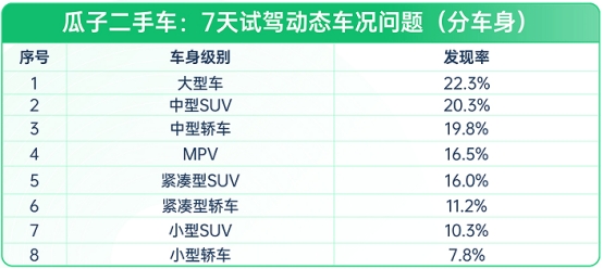 (图:瓜子二手车-7天试驾动态车况问题-分车身级别)