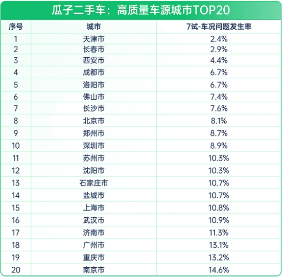 (图:瓜子二手车-高质量车源城市TOP20)