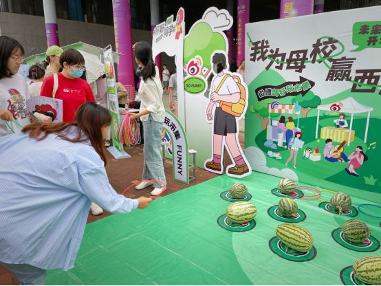 此外,开学季期间,“我为母校赢西瓜”大赛也火爆出圈,“万斤西瓜将归属谁的母校”引发全网关注。在线上,学生们纷纷到微博小程序养成瓜苗播撒太阳,助力本校赢取万斤西瓜。在线下,学生们又化身“套瓜群众”,实现“吃瓜自由”。