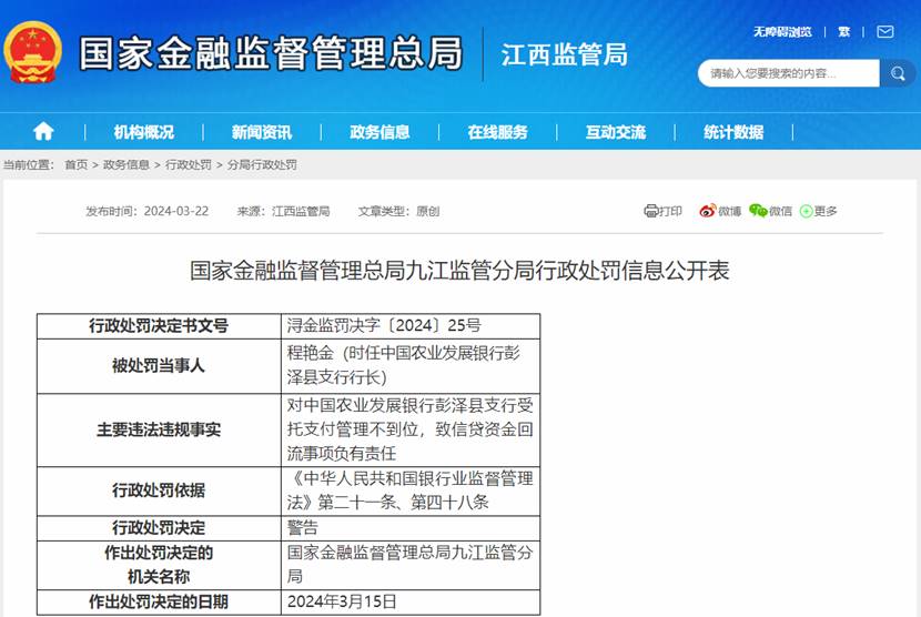 中国青年网讯3月22日,国家金融监管局江西监管局发布消息。时任中国农业发展银行彭泽县支行行长的程艳金,因对该行受托支付管理不到位,致信贷资金回流事项负有责任被行政处罚。
