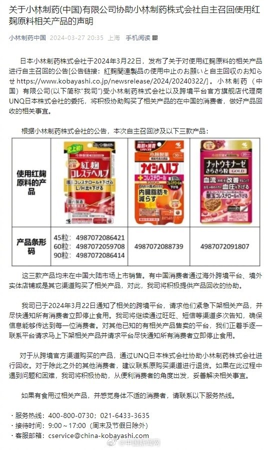 关于小林制药(中国)有限公司协助小林制药株式会社自主召回使用红麹原料相关产品的声明
