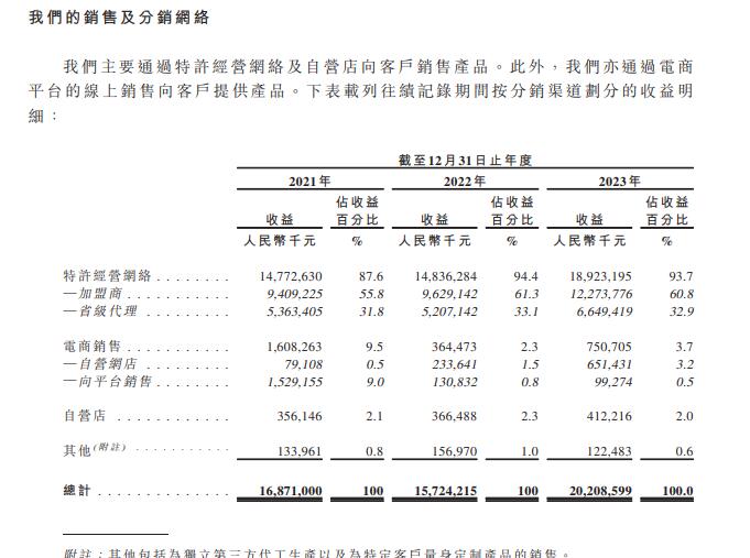 招股书显示,梦金园的特许经营网络覆盖1,687名加盟商旗下经营的2,817家加盟店、七个自营直营区服务中心及17个省级代理。其他销售渠道包括35家自营店、向在线平台销售以及消费者网络中主流电商平台入驻网店。2021年、2022年及2023年,梦金园每家加盟店的平均收益分别为人民币550万元、人民币540万元及人民币670万元。