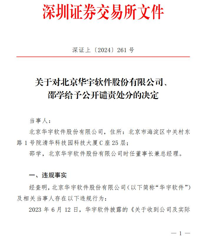 鉴于上述违规事实及情节,经深交所纪律处分委员会审议通过,深交所对北京华宇软件股份有限公司给予公开谴责的处分;对北京华宇软件股份有限公司时任董事长兼总经理邵学给予公开谴责的处分。