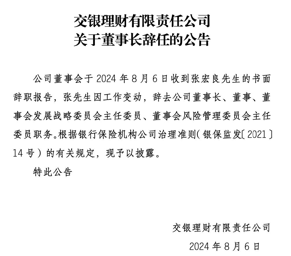 中国青年网讯(记者 张亚云 实习生 李诗雨)8月6日,交银理财公告称,张宏良因工作变动,辞去公司董事长、董事、董事会发展战略委员会主任委员、董事会风险管理委员会主任委员职务。