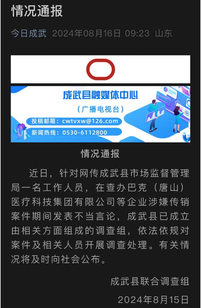 中国青年网讯(记者 宿希强)8月15日,山东成武县发布通报称,近日网传成武县市场监督管理局一名工作人员,在查办巴克(唐山)医疗科技集团有限公司(下称“巴克医疗集团”)等企业涉嫌传销案件期间发表不当言论,成武县已成立由相关方面组成的调查组,依法依规对案件及相关人员开展调查处理。有关情况将及时向社会公布。
