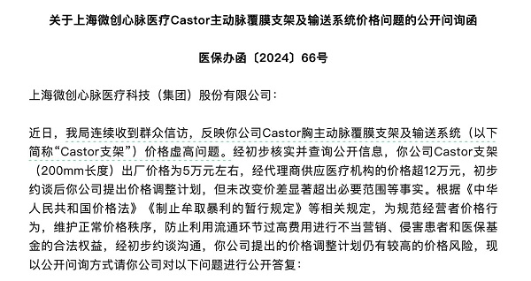 问询函称,近日,该局连续收到群众信访,反映微创心脉医疗Castor胸主动脉覆膜支架及输送系统(以下简称“Castor支架”)价格虚高问题。经初步核实并查询公开信息,Castor支架(200mm长度)出厂价格为5万元左右,经代理商供应医疗机构的价格超12万元,初步约谈后微创心脉医疗提出价格调整计划,但未改变价差显著超出必要范围等事实。