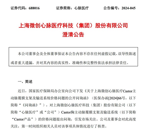 中国青年网讯 (记者 张亚云 实习生 沈天奕)8月19日,国家医保局官方公众号发文显示,国家医疗保障局办公室向微创心脉医疗发出公开问询函。