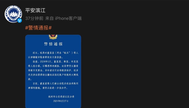 8月27日晚间,杭州市公安局滨江区分局通过“平安滨江”发布警情通报:董某某(网名:铁头)等人涉嫌敲诈勒索罪已被采取刑事强制措施。