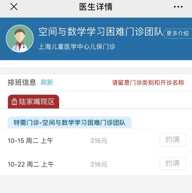 从官方预约挂号渠道来看,这一门诊为儿保特需门诊,挂号费316元,首批开放预约的名额在10月8日、10月15日和10月22日,每天限号8人,三天的就诊号源已全部被约满。