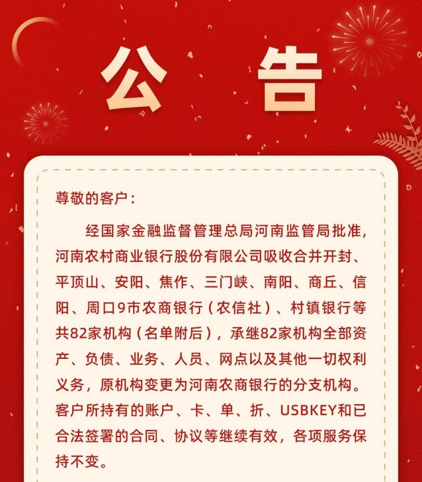 中国青年网讯(记者 白珂嘉)河南农商银行28日发布公告,经国家金融监管总局河南监管局批准,河南农村商业银行股份有限公司(以下简称“河南农商银行”)吸收合并开封、平顶山、安阳、焦作、三门峡、南阳、商丘、信阳、周口9市农商银行(信用社)、村镇银行等共82家机构,原机构变更为河南农商银行的分支机构。