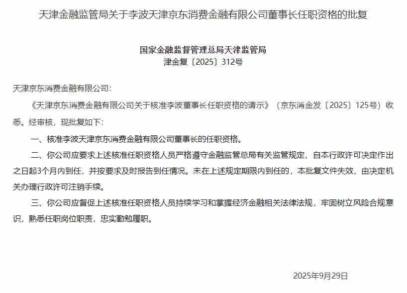 中国青年网讯 国家金融监督管理总局天津监管局10月10日发布的批复显示,核准李波天津京东消费金融有限公司(下称“京东消金”)董事长的任职资格。