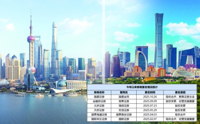 2025年,证券行业迎来更名大年。据上海证券报记者统计,年内已有6家券商完成名称变更。从并购重组催生的国联民生、国泰海通,到股权变更后亮相的天府证券、北京证券,再到剥离多元业务、聚焦主业的国盛证券,这些新名称的背后,并非简单的品牌焕新,而是在牌照红利消退、业务同质化严重等“旧烦恼”下,叠加监管“打造航母级券商”引导与地方国资整合诉求后,券商展开的一场关于生存与转型的集中探索,折射出整个证券行业在时代变革中的战略重构。
