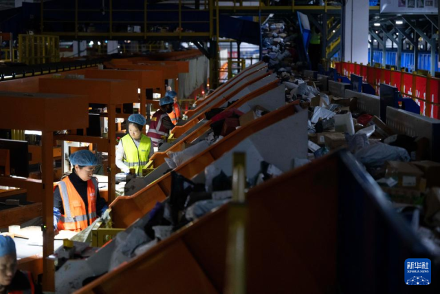 “双十一”网购高峰期到来,中国邮政集团有限公司黑龙江省哈尔滨邮区中心灯火通明,一片繁忙景象。