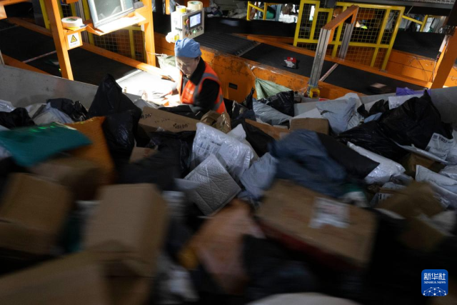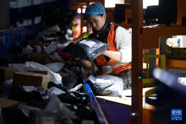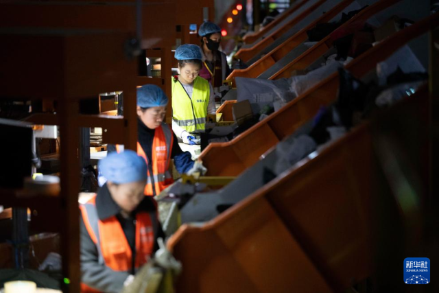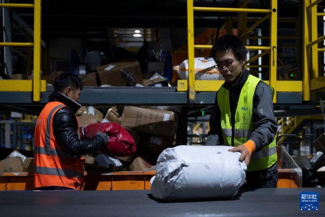 11月10日晚,在中国邮政集团有限公司黑龙江省哈尔滨邮区中心,工作人员在分拣快递。