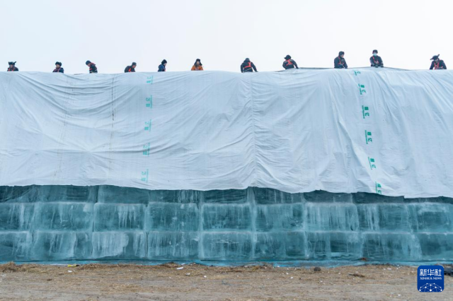 11月24日,在哈尔滨冰雪大世界存冰场,工作人员拆除冰垛外层遮盖物。