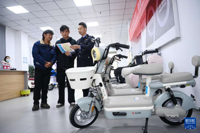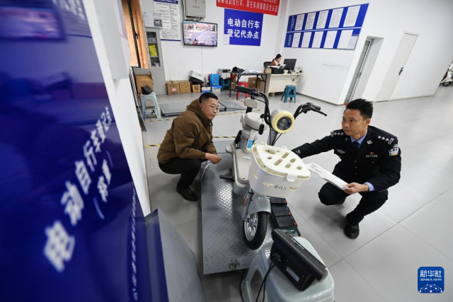 12月1日,湖北省襄阳市交警支队车管所民警按新国标流程查验电动自行车。