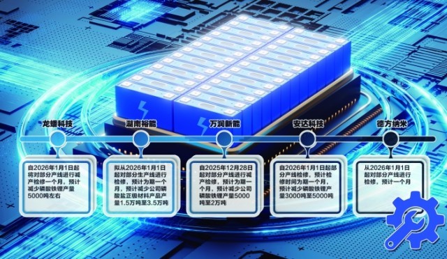 12月25日至29日,万润新能、湖南裕能、德方纳米、安达科技、龙蟠科技等磷酸铁锂产业上市公司相继披露检修减产计划,时间集中在2026年1月。5家公司的合计市场份额占行业“半壁江山”,其中多家1月减产幅度为35%至50%。