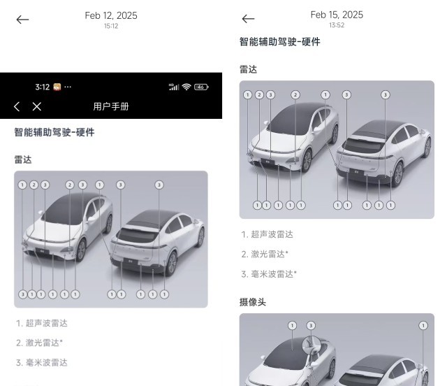 左图为2025年2月12日小鹏App用户手册截图,显示毫米波雷达数量为5颗。右图为用户投诉后,即2025年2月15日小鹏App用户手册截图,显示毫米波雷达数量为3颗,2颗前角毫米波雷达已取消。制图 刘大江