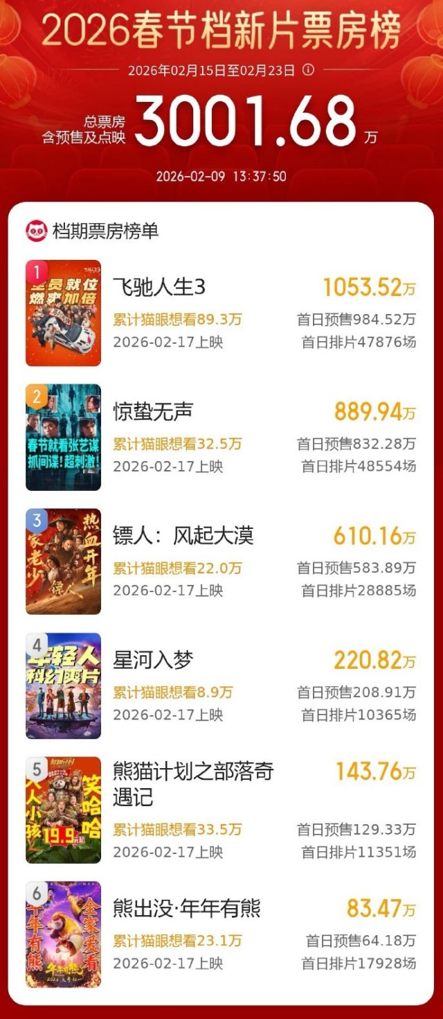 央视网消息:据网络平台数据,2026年春节档新片预售总票房破3000万,《飞驰人生3》《惊蛰无声》《镖人:风起大漠》分列2026年春节档新片预售票房榜前三。