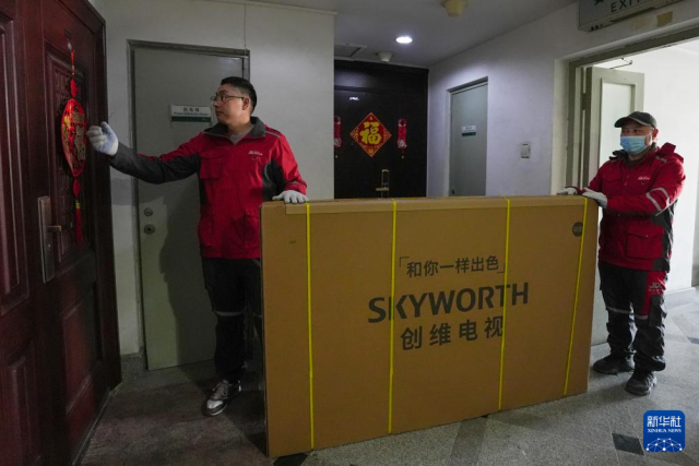 2月11日,在北京市朝阳区一个小区内,京东快递的快递员在配送消费者使用国家补贴购买的电视机。