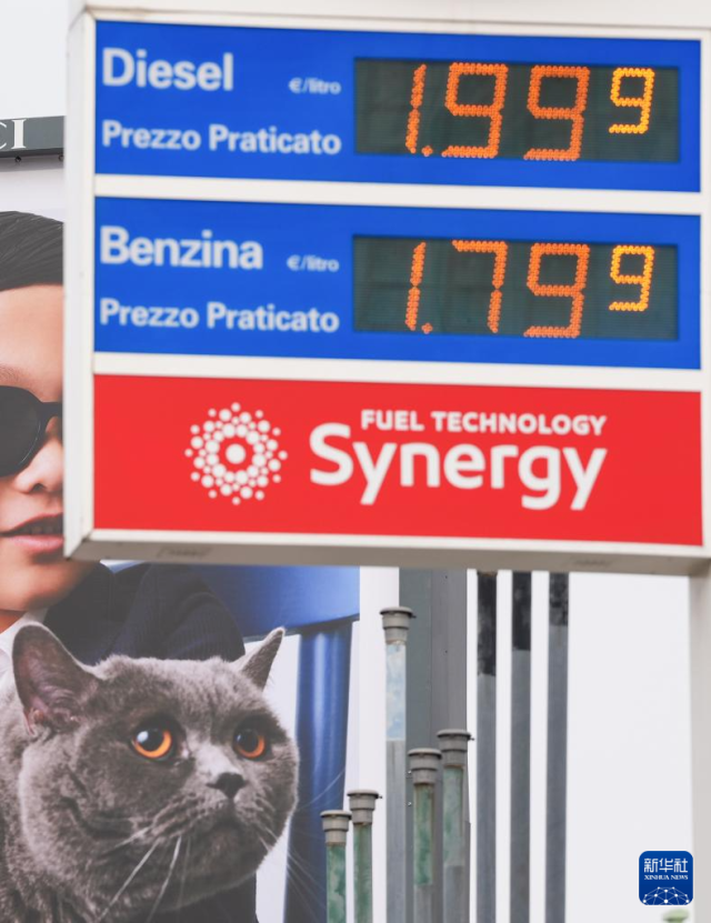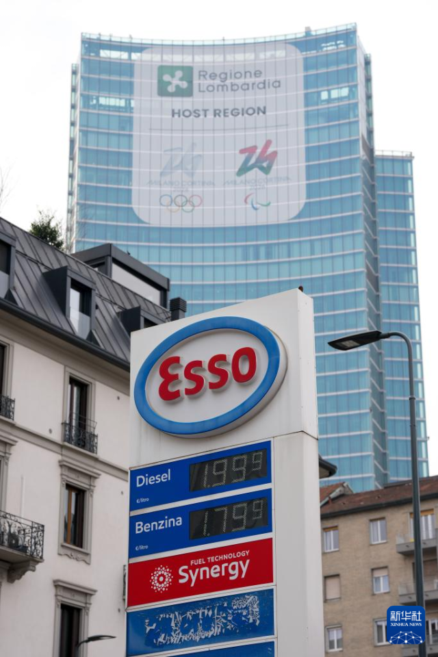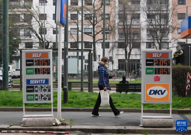 这是3月11日在意大利米兰市中心拍摄的一家加油站的油价牌。