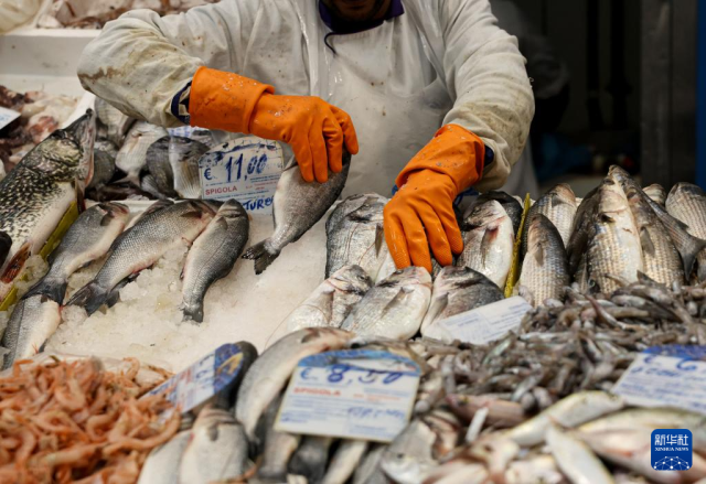 3月31日,在意大利罗马一处菜市场,售货员在摆放海鲜。
