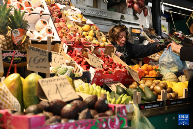 这是3月31日在意大利罗马一处菜市场拍摄的水果摊。