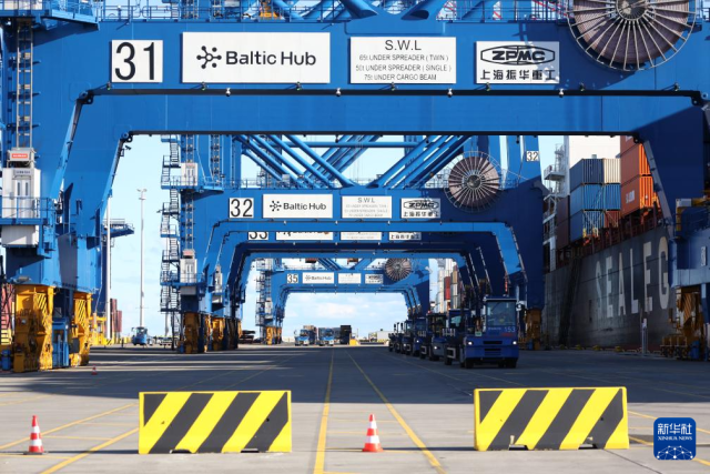 10月19日,在波兰北部格但斯克港,从中国宁波舟山港出发的中欧北极快航航线首艘货船进行装卸工作。