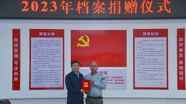 楚雄州委副秘书长、办公室主任、州档案局局长左刚为捐赠人颁发捐赠证书并合影留念。